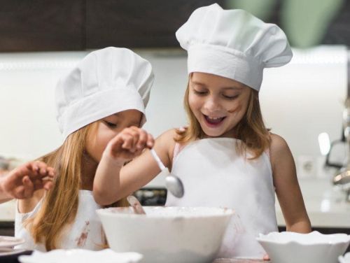 Τα παιδιά φοράνε τις ποδιές μαγειρικής τους & μαγειρεύουν γλυκίσματα.